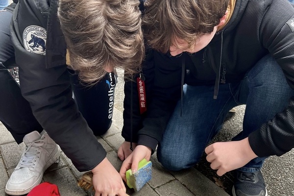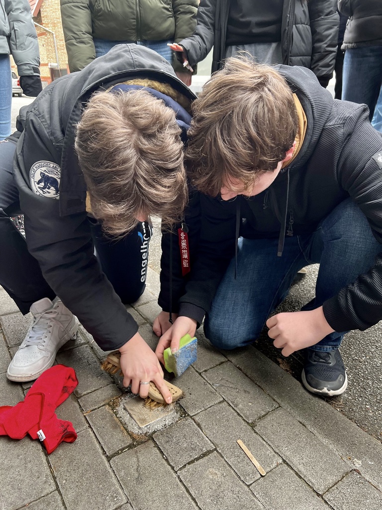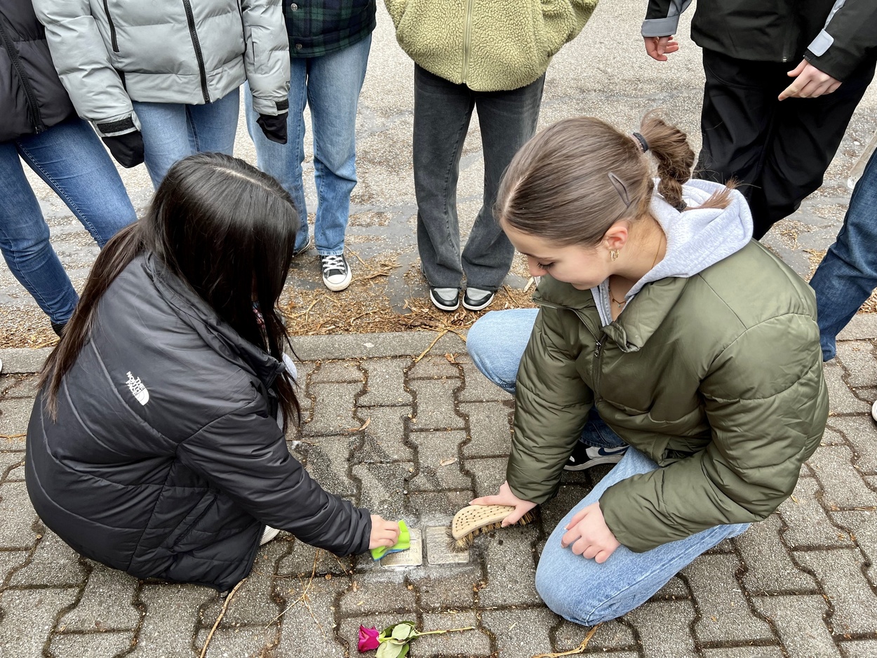 Außerdem begaben sich auch diese Jahr wieder zwei 9. Klassen zusammen mit Herrn Vogel und Herrn Weber auf lokalgeschichtliche Spuren. Hemsbach hatte lange Zeit eine kleine, aber gut funktionierende jüdische Gemeinde, die größten Teils im Nationalsozialismus ausgelöscht wurde. Der Erinnerung an sie hat sich der „Förderverein der ehemaligen Synagoge“ gewidmet, dessen Website viele Informationen zu den Biografien bietet. So konnten die Schülerinnen und Schüler Kurzvorträge vorbereiten, um die jeweiligen Einzelschicksale dem Rest der Klasse näher zu bringen. Damit dies nachhaltiger gestaltet werden konnte, trat man einen Rundgang durch Hemsbach an, ausgestattet mit Schwamm, Lappen und Putzmittel. Denn bereits vor Jahren sind „Stolpersteine“ in den Boden vor den jeweiligen Wohnhäusern eingelassen worden, die nun von Dreck und Schmutz befreit werden sollten. Nach etwa einer Stunde waren alle Messingplatten gesäubert und gleichzeitig den jüdischen Mitbürgerinnen und Mitbürgern mit kleineren Vorträge und einer niedergelegten Rose gedacht.