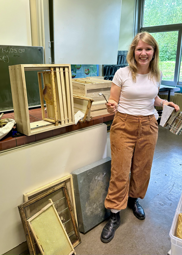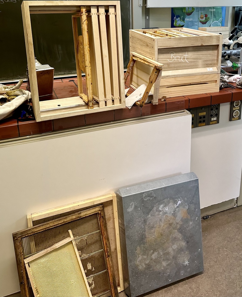 Die Schüler*innen waren ganz ehrfürchtig, als sie Frau Finn mit dem Gesichtsschutz und Handschuhen vor den Bienenwaben stehen sahen. Die Kleidung wurde jedoch nur zum Zeigen mitgebracht. In den mitgebrachten Waben befanden sich keine fertig entwickelten Bienen, lediglich Larven. Frau Finn erklärte der Klasse, was es bedeutet, Bienen zu halten und welche Aufgaben sie erfüllen muss. Interessant war, dass einige Arbeiten, z.B. das Präparieren der Rähmchen für den Wabenbau der Bienen, auch im Winter erledigt werden können. Besonders fasziniert waren die Schüler*innen von den mitgebrachten Werkzeugen, z.B. dem Stockmeißel, mit welchem Rähmchen angehoben werden können, oder einem sogenannten Smoker, durch dessen Rauchentwicklung ein ruhiges und sticharmes Arbeiten am Bienenvolk möglich wird, da die Bienen den Rauch als Gefahr empfinden und sich zurückziehen, um ihre Honigblase für eine mögliche Flucht zu füllen.