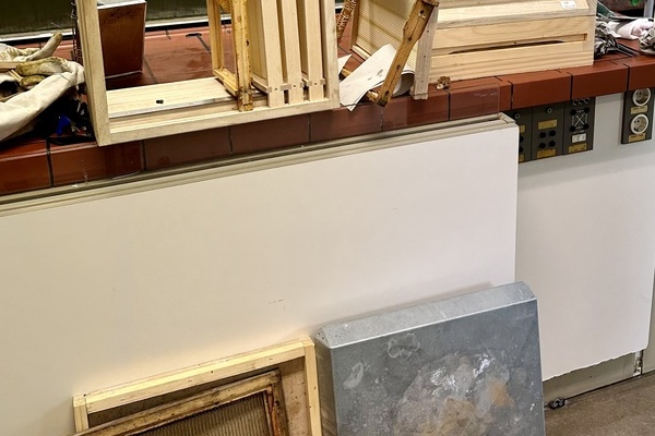 Frau Finn brachte mehrere Zargen mit. Das sind viereckige Rahmen aus Holz oder Kunststoff, in welche die Rähmchen für den Wabenbau gehängt werden. Mehrere Zargen bilden eine Beute, also die Behausung, die den Bienen bereitgestellt wird.