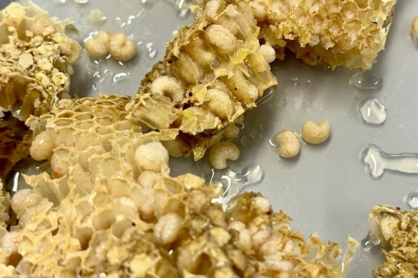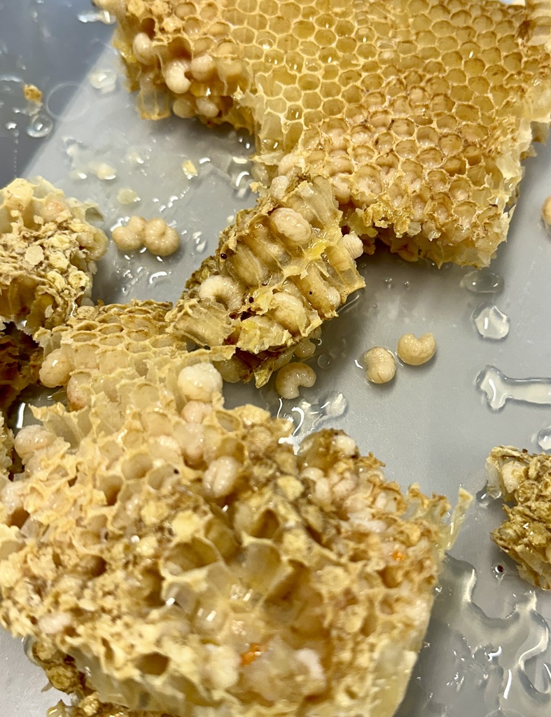 Beeindruckend waren Königinnenlarven im Gelée Royal schwimmend sowie Waben, in welchen Bienenlarven der männlichen Bienen (Drohnen) zu sehen waren. Die Königinnenlarven werden gebrochen, damit das Bienenvolk nicht schwärmt, die Drohnenbrut wird zur Bekämpfung der Varroamilbe regelmäßig aus dem Bienenstock entfernt. Diese Milben sind an den Larven als dunkle Flecken sehr gut erkennbar. Die Varroamilbe, die ursprünglich aus Asien kommt, ist der wohl gefährlichste Bienenschädling. Sie lebt als Parasit an der Honigbiene und entwickelt und vermehrt sich in der Brut im Bienenstock.