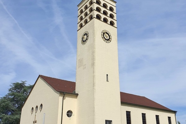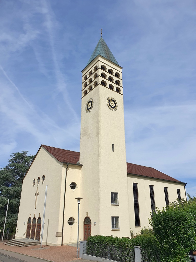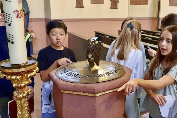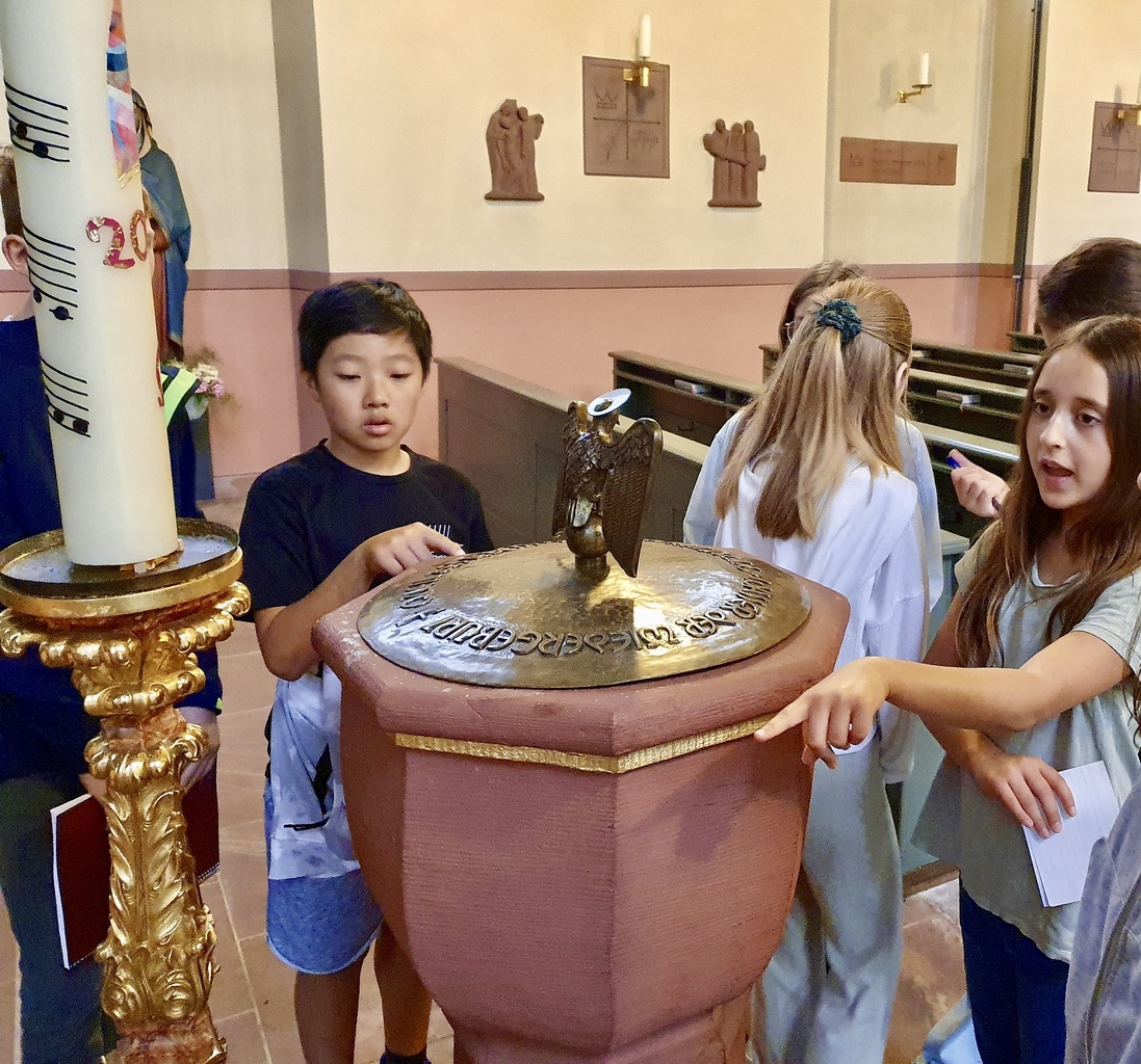 Den Anfang machte die katholische Kirche St. Laurentius: Hier durften die evangelischen Gäste den sorgfältig vorbereiteten Kurzvorträgen ihrer katholischen Mitschüler*innen lauschen - so lernten sie Spannendes zu Altarraum, Kirchenfenstern und Taufstein. Insbesondere typisch katholische Elemente, wie Weihwasserbecken und Heiligenfiguren, weckten das Interesse der jungen Besucher*innen. Mit einem stimmungsvollen Segen endete die erste Besichtigungstour.