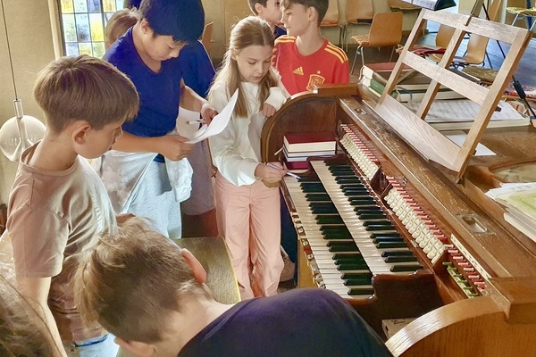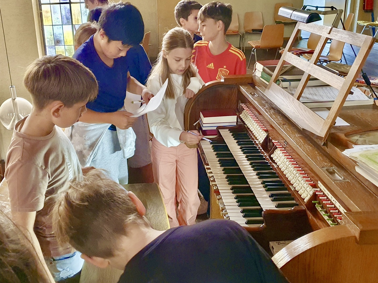 Zwei Wochen später folgte der Gegenbesuch in der evangelischen Christuskirche. Hier erkundeten die Schüler*innen neben dem Kirchenraum und den Kirchenfenstern auch das Gemeindehaus. Das Highlight aber war der Besuch auf der Empore bei der „Königin der Instrumente": Nachdem fleißig alle Pfeifen und Tasten der Orgel gezählt worden waren, durften die Schüler*innen selbst zur Tat schreiten und einige Takte spielen - mit beachtlichem Erfolg!