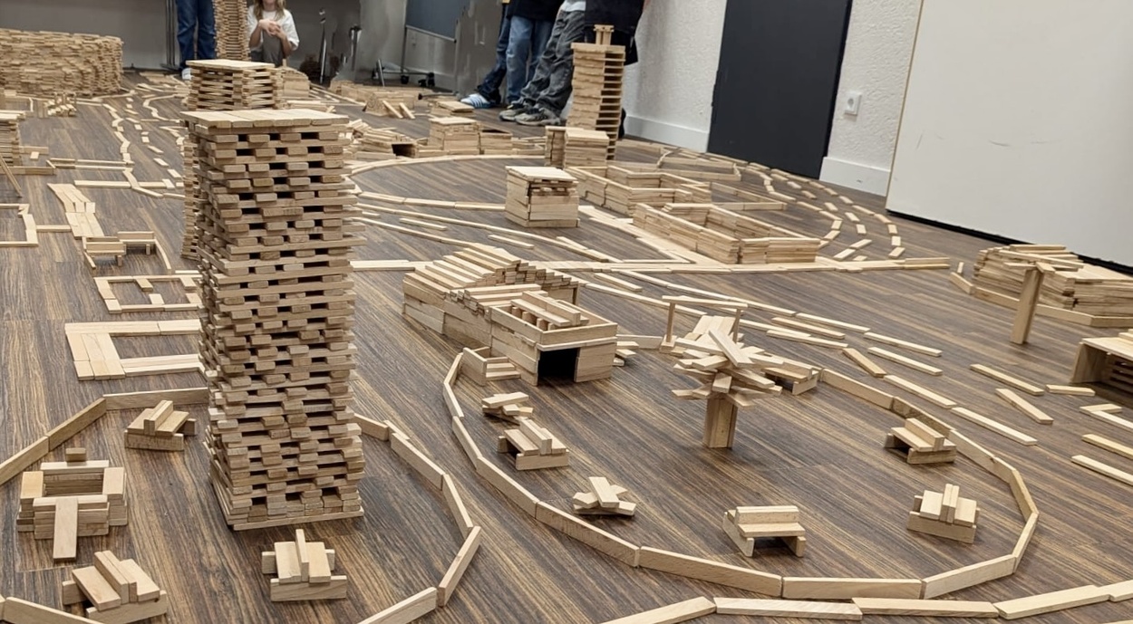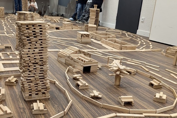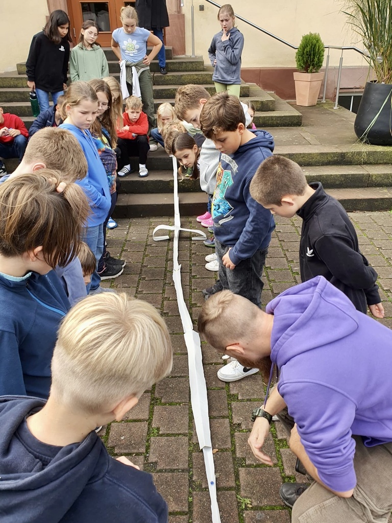 Nach einstündiger Anfahrt per Bahn starteten wir nach dem Mittagessen und dem Bezug der Zimmer mit dem Teamtraining, bei dem wir Klassenlehrerinnen durch erlebnispädagogisch geschulte Teamer unterstützt wurden. Das Teamtraining startete mit Gruppenspielen im Wormser Stadtpark und an der Jugendherberge oder auch mit dem sogenannten „Städtebau“ aus ‚Kapla‘ (Holz-)-Bausteinen, wobei die Klasse auf Zeit gemeinsam als Team eine Klassenstadt anhand vorgegebener Kriterien baut: Jede*r Schüler*in baut allein oder im Team ein Gebäude, jedes Gebäude (bis auf Wohnhäuser) darf es nur einmal in der Klassenstadt geben und die Gebäude müssen alle – sei es durch Straße, Bahntrassen o.Ä. - miteinander verbunden sein. Die Schüler*innen waren konzentriert und mit großem Eifer bei der Sache und errichteten im Team abwechslungsreiche und sehr schöne Teamstädte.