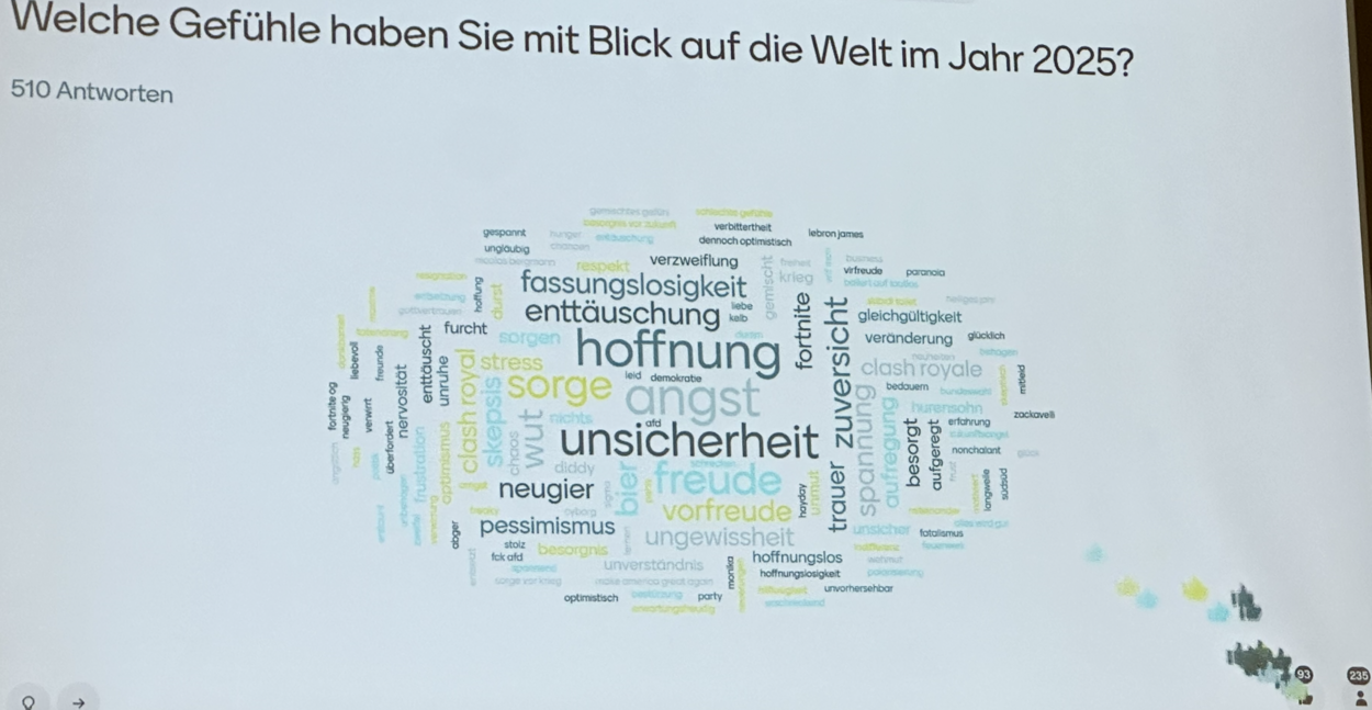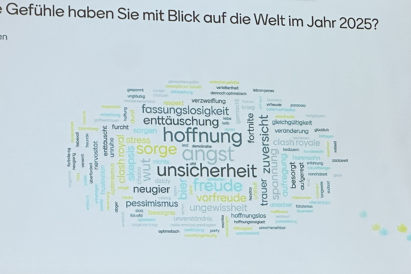 Zum Einstieg wies Prof. Dr. Moos darauf hin, was in diesem, noch sehr jungen, Jahr 2025 bereits alles passiert ist: Die Welt ist im Wandel, es brodelt in verschiedenen Bereichen und Gebieten, und so war die erste Frage an die Schüler*innen im Saal, mit welchen Gefühlen man in das Jahr 2025 blickt. Die Schüler*innen konnten sich über ihre Handys interaktiv beteiligen, so dass die Antworten live angezeigt wurden und betrachtet werden konnten.