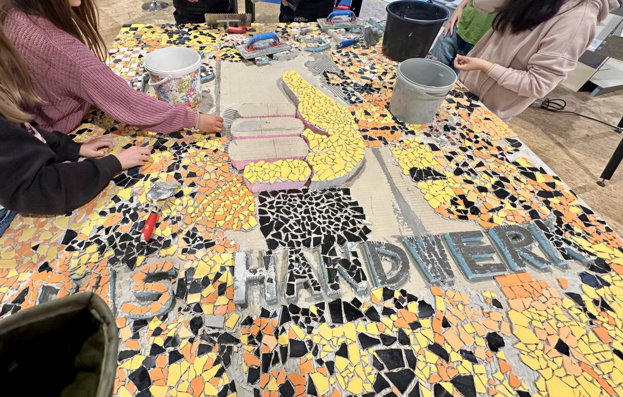 Die Schüler*innen wurden in zwei Gruppen eingeteilt. Eine Gruppe hatte jeweils frei verfügbare Zeit auf dem Maimarktgelände, während die zweite Gruppe in der Halle 05 an einem Workshop teilnahm. Bei diesem Workshop klapperten die Schüler*innen in Kleingruppen die verschiedenen Stände ab, erfuhren mehr über die vielen verschiedenen und vielseitigen Berufe, durften Fragen stellen und sich an unterschiedlichen praktischen Arbeiten versuchen.