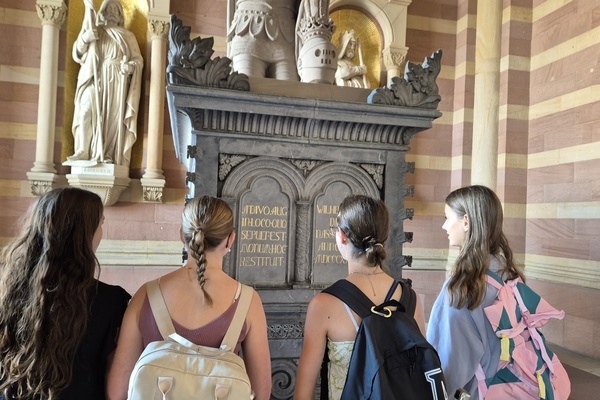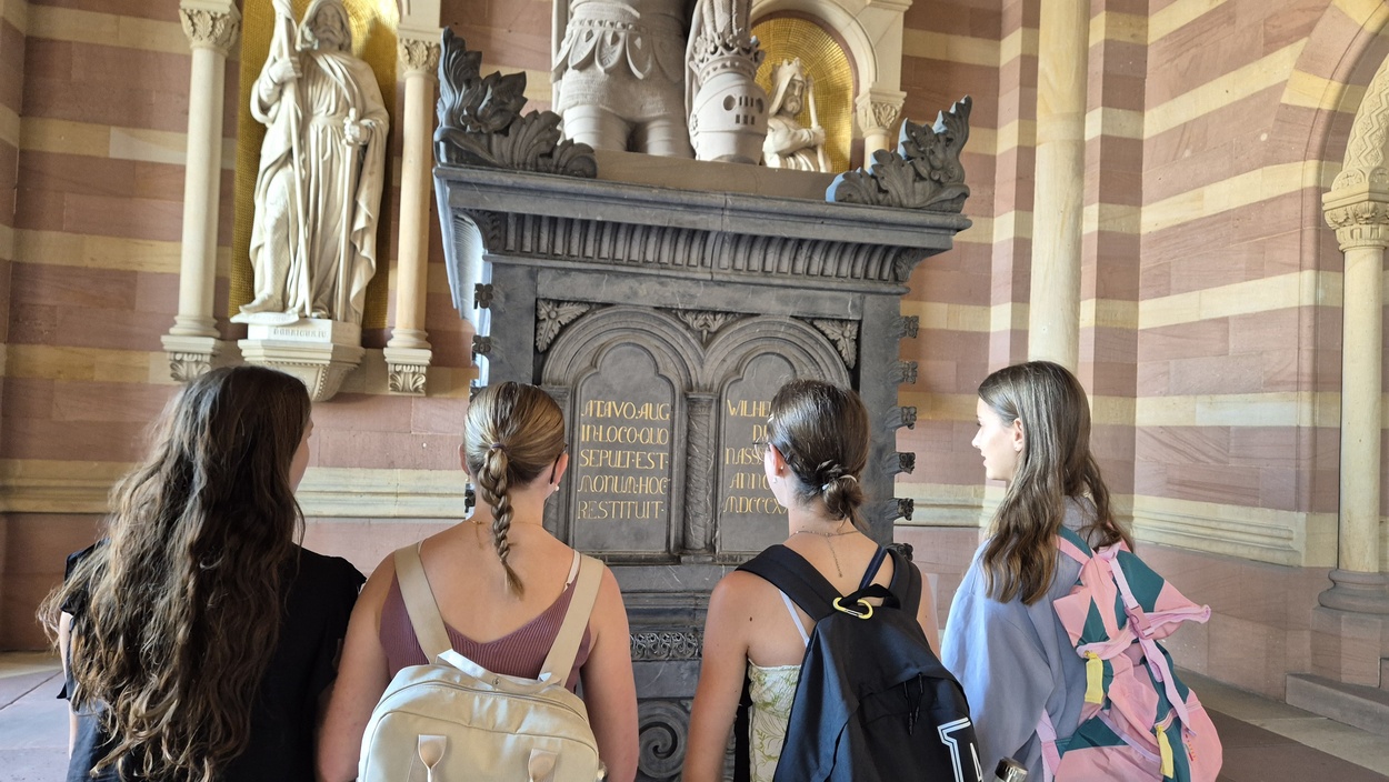 Ein erstes Highlight war dann der Besuch des Speyerer Doms, des UNESCO-Weltkulturerbes und imposanten Wahrzeichens der Stadt: Ausgerüstet mit einem Rätselbogen begaben sich die Schüler*innen auf eigene Faust auf eine Erkundungstour und identifizierten so manche lateinische Inschrift auf den Grabplatten und an den Fassaden des beeindruckenden Sakralbaus.