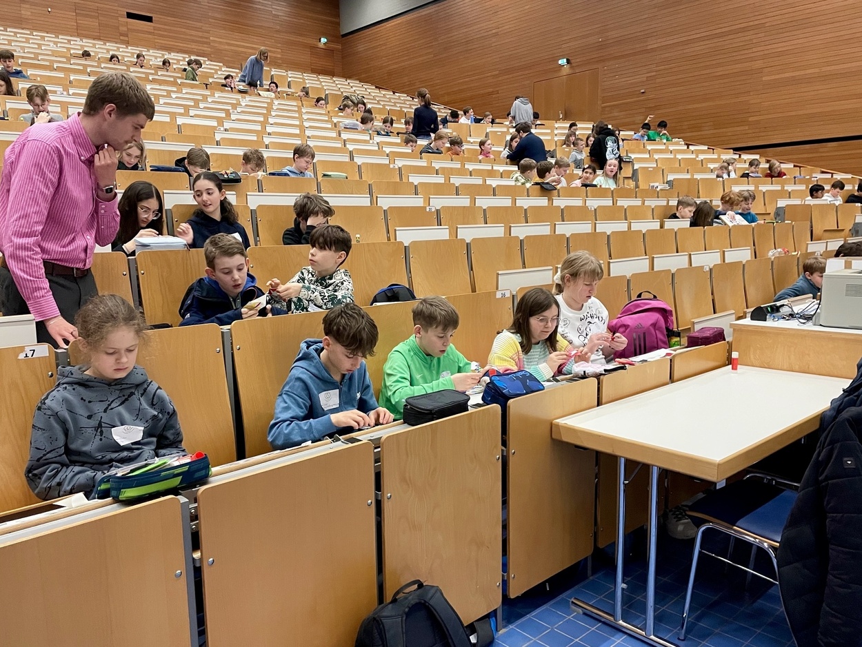 Das Bergstraßen-Gymnasium nahm in diesem Jahr erstmalig mit zwei Teams, jeweils einem Team der Unter- und Mittelstufe, teil, die von Frau Bausewein und Frau Wackler begleitet wurden. Insgesamt zehn Schülerinnen und Schüler aus den Klassen 6 und 9 stellten sich der Herausforderung. Alle waren von der Stimmung an diesem Tag sehr motiviert und so rauchten die Köpfe im Team-Wettbewerb. Nach einer Stärkung in der Mensa auf dem Universitätscampus im Neuenheimer Feld durften die jüngeren Schülerinnen und Schüler am Nachmittag mathematisch basteln während die älteren an verschiedenen Stationen mathematisch spielen, knobeln, bauen oder zeichnen konnten.