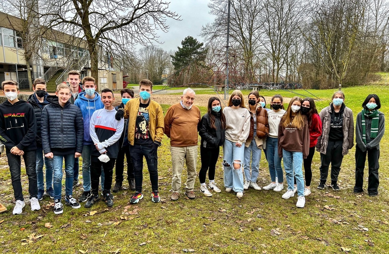 Die dritte 9. Klasse durfte Georges Stern aus Mannheim als Zweitzeugen an der Schule willkommen heißen. Herr Stern hat nicht „direkt“ den Holocaust erlebt, wenngleich er 1944 geboren wurde. Seine Eltern überlebten das Konzentrationslager Gurs einen Tag vor der Deportation nach Auschwitz, indem sie spanischer Wärter bestachen. Der Vatter hatte einen 100 Dollarschein im Griff seines Rasierpinsels versteckt – das war die Rettung. Jüdische Hilfsorganisationen, die im Untergrund arbeiteten, verhalfen der Familie unter falschem Namen, in Lyon unterzukommen. In der Höhle des Löwen. Denn nicht nur, dass man sich mit Lyon den von den deutschen besetzten Teil Frankreichs als neue Bleibe ausgesucht hatte, sondern auch noch die Stadt, in der der so genannte „Schlächter von Lyon“, der dortige Gestapochef Klaus Barbie, als „Judenjäger“ sein Unwesen trieb. Hier wurden zunächst die Tochter und dann der Sohn, Georges Stern, geboren. Die Familie überlebte und entschloss sich 1950, in die Heimat nach Mannheim zurückzukehren. In der sich dann auch noch die Mutter, Opfer des Nationalsozialismus, einer Entnazifizierungsaufforderung gegenübersah.