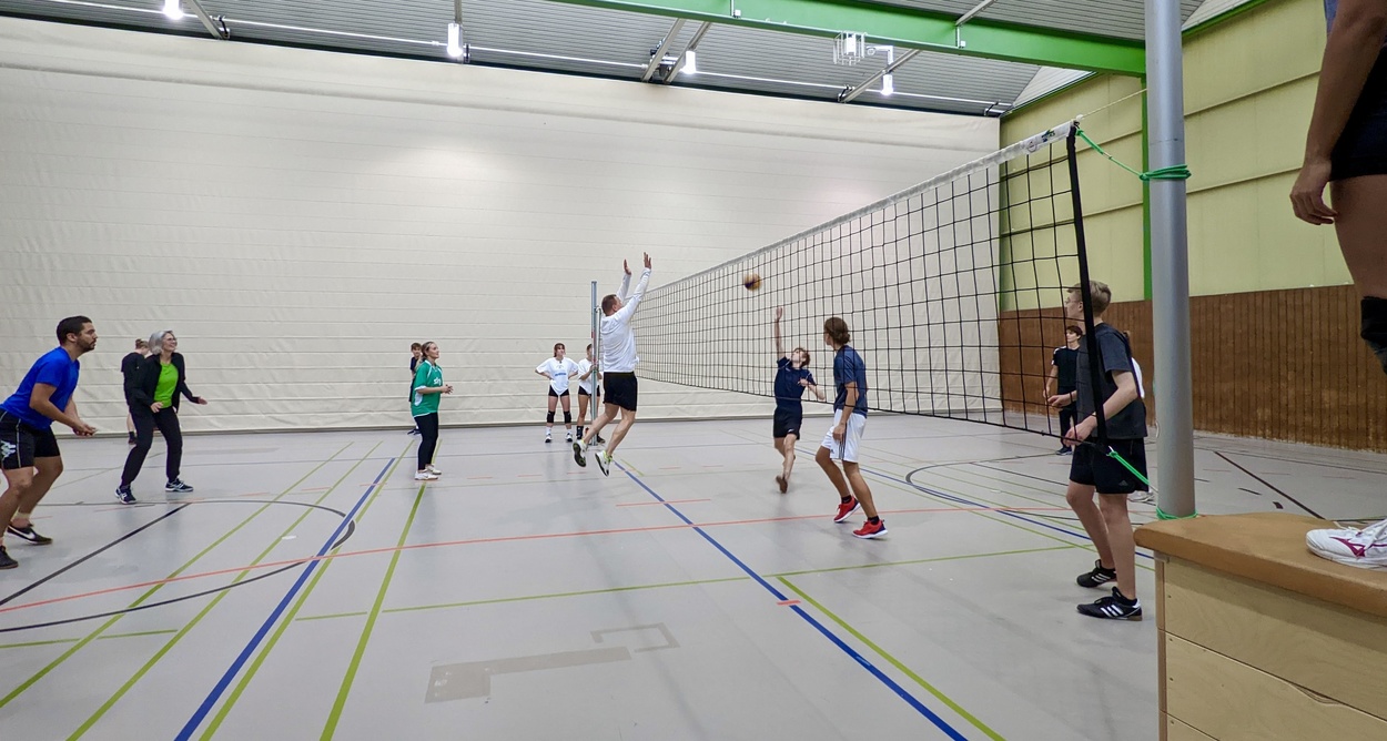 Im Völkerball, bei dem nur Schülerteams gegeneinander antraten, konnte die Kursstufe 2 (K2) gewinnen. Das tapfere und fröhliche Volleyballteam der Lehrkräfte schaffte es trotz größter Anstrengungen nicht ins Finale. Dieses gewann die K1 in einem spannenden Match gegen die K2.